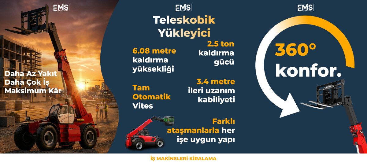 Teleskobik yükleyiciler, teleskopik bom teknolojisi sayesinde yüksek erişim gerektiren yük taşıma ve kaldırma operasyonlarında kullanılan güçlü iş makineleridir. EMS Terminal olarak farklı büyüklük ve kapasitelere sahip teleskobik yükleyiciler ile şantiye, sanayi ve lojistik alanlarında profesyonel hizmet sunmaktayız.